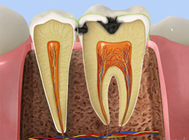 健康な歯は一番外側にエナメル質という固い部分があり内側に象牙質というやや軟かい部分がある2層構造となっています。象牙質の内側には歯髄腔という空洞があり、そこには神経と血管が詰まっています。