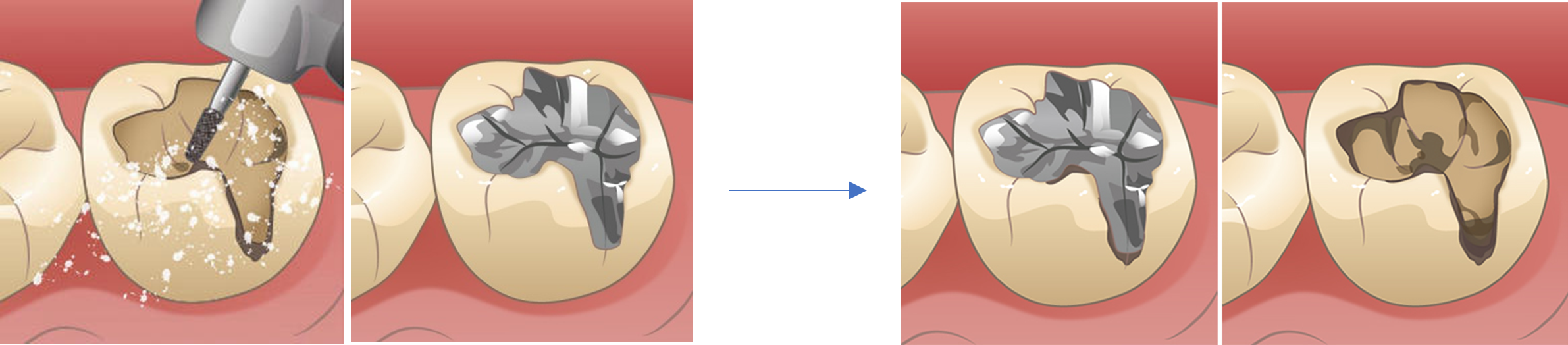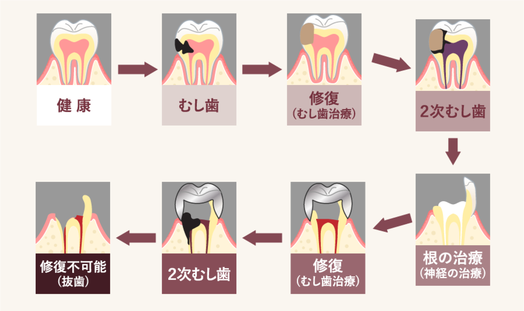 虫歯にならないことがベストです。一度虫歯を経験すると長期間の間に下の図のような経過をたどる方がいらっしゃいます。