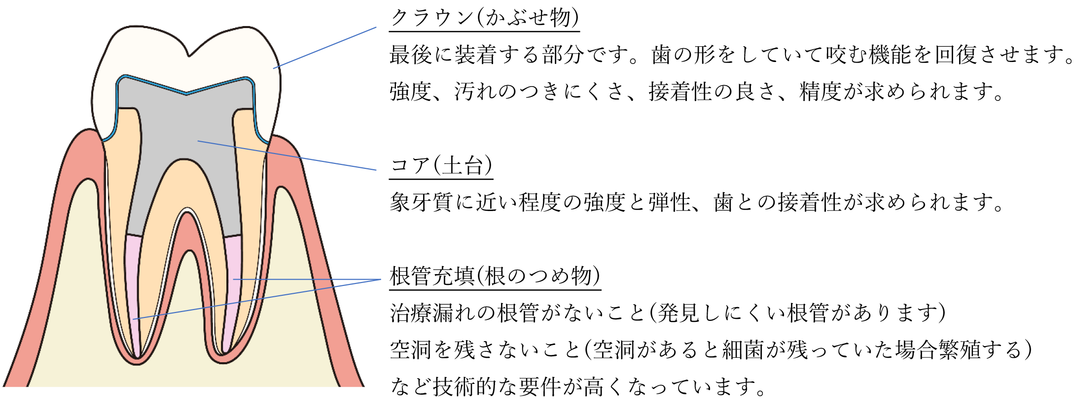 根管治療の目的は歯の中の感染・汚染を除去したうえで適切に封(蓋の役割)をすることです。この封とは①歯の中の詰め物(根管充填)、②土台 (コア)、③かぶせ物(クラウン)の3種類です。これらの内どこかに不備があると再感染による不具合が出ます。理想的に仕上がった根管治療終了時のイラストを下に表示します。
