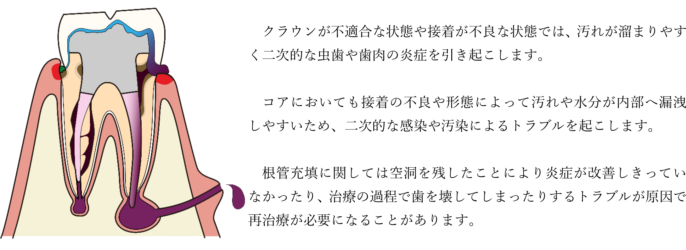 誰も得をしない状態になります。再治療が困難で抜歯を提案することもあります。治療には時間と期間がかかりますが根気よく通院ください。