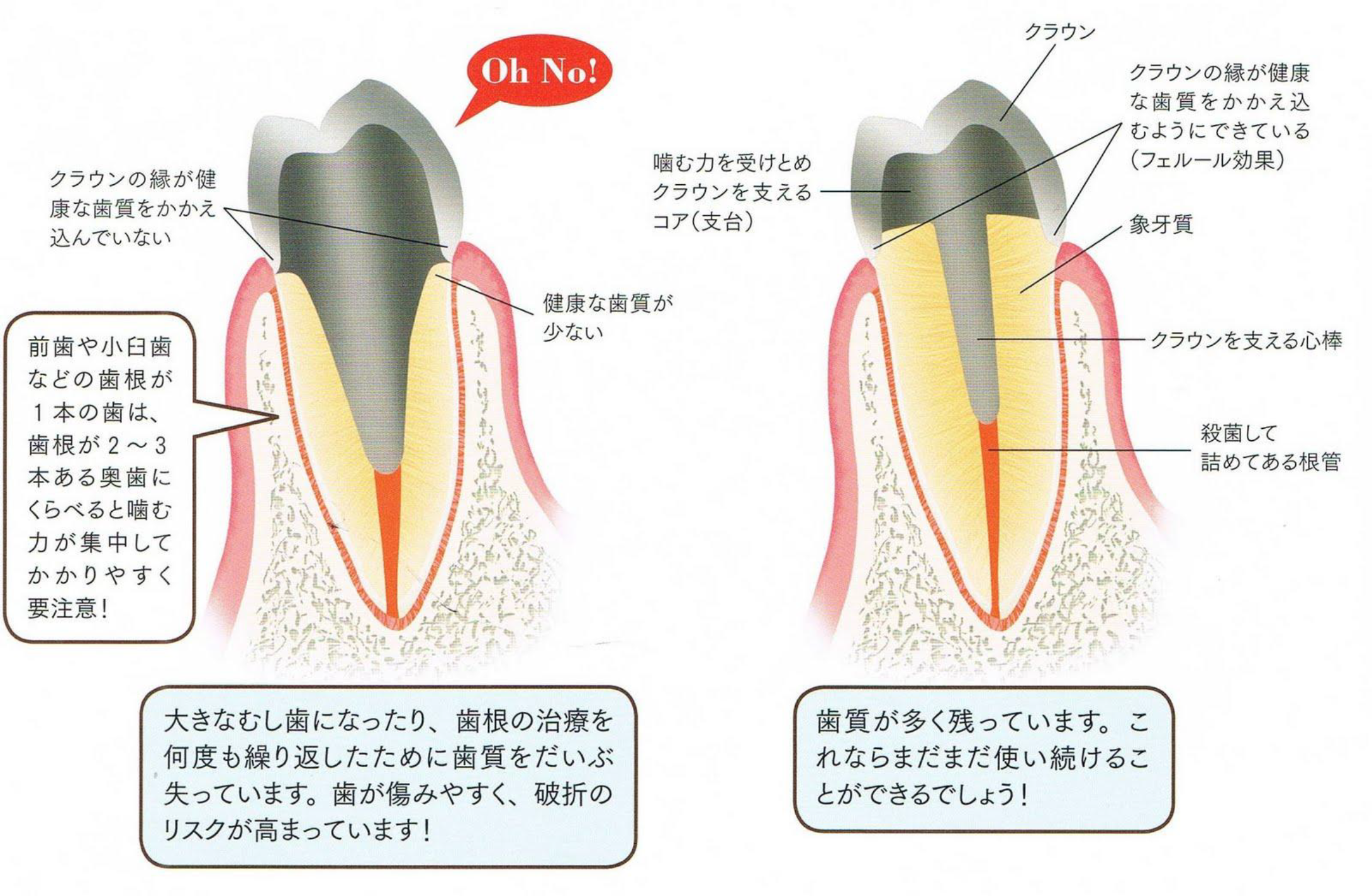 フェルール効果がありません。歯の形歯の回復が不可能なわけではありませんが、