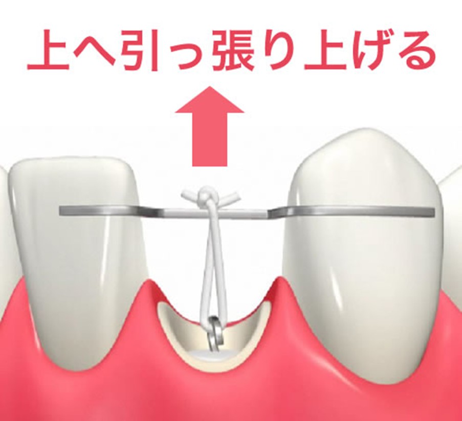 矯正治療は歯を引っ張り出す方法です。近隣の歯にワイヤーを渡し引っ張り出したい歯にはフックをかけてゴムの力で引き上げます。