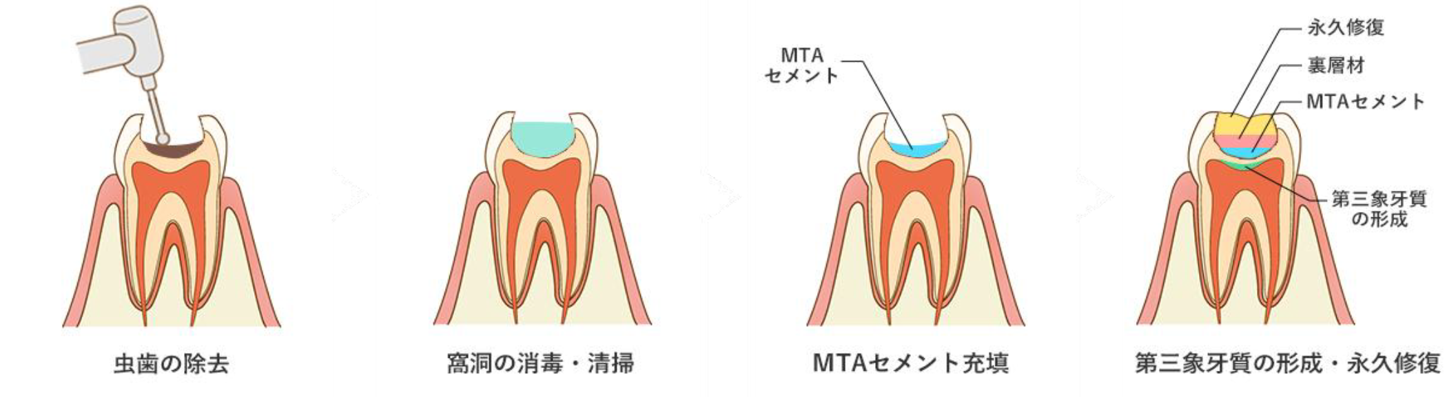 露出した神経部分を止血し薬剤で保護した状態で封鎖する治療方法です。薬剤を露出した神経部分に置いて固めたのちにC2と同じようにつめ物をします。神経を取ってしまう根管治療を第一選択にしないことで神経を守ります。治療直後は痛みがあったりしますが徐々に痛みは退いていくことが多い傾向です。しかし、しばらくは症状がなかったとしても何か月後、何年後かに症状が出ることがあります。歯の神経が長期間かけて徐々に壊死していくためです。この壊死は無症状に進行する場合があり、術後数週間程度では成功しているか判断することはできません。症状により歯の神経を一部切断する断髄という処置や神経を全て取り除く抜髄という処置に移行する可能性があります。